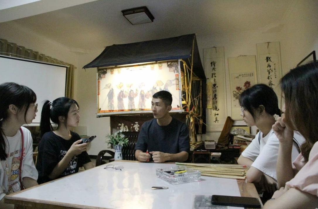 作为吴氏纸影非遗事业传承人,吴渊老师致力于与时俱进创新传承与发展的理念。他向我们指出,现今在湘潭纸影传承过程中最重要的一点是“古老非遗,快乐传承”,这也是传承人每次活动的目标和口号。在以前纸影戏起着育人和传教化知礼节的作用,而现在更多的是服务大家的精神文化生活。因此,纸影的传承在当下应重在创新和与时俱进,在参与中感受其魅力。吴渊老师向实践团成员解释:“皮影的整个过程是一个立体、综合的门类,人们参与进来可以锻炼动手能力,在对角色的观察和了解之后,还可以编排一个故事、表演、互动。这是一个团队协作的过程,讲究成员之间的配合与沟通。所以现在的模式不再是用故事教育人或者是主播来做纯粹的宣讲,而是在展示的过程中,让观众参与进来,让他们成为我们的演员,扮演这一个角色,用光和影的形式表达自己。”