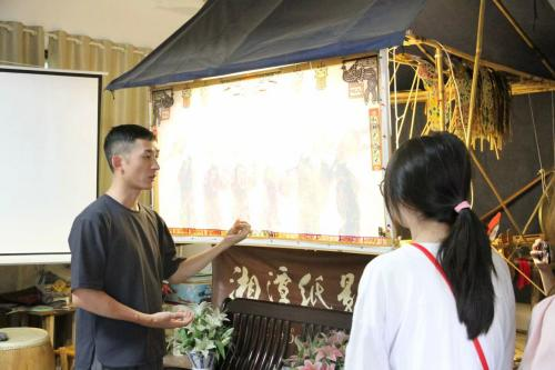在传承人吴升平老人的介绍中,实践团成员基本了解了湘潭纸影的历史文化发展、纸影戏所描述的历史故事、对外交流过程、南方纸影与北方皮影的区别以及纸影戏中的用到的乐器类型等。