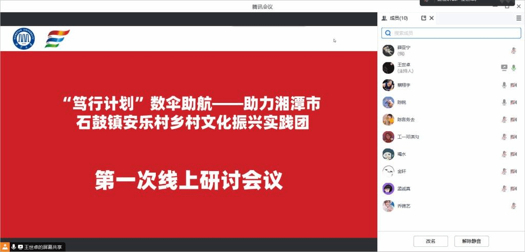 石鼓油纸伞是湖南省重要的非物质文化遗产之一,如何传承和发扬石鼓油纸伞,是实践团一直在思考的问题,推陈出新,让古老的文化迸发出犹如新生般的活力,更是实践团努力的方向。为了交流当前的工作进度,明晰后续的工作安排,2023年7月25日,绅士仓库 笃行计划全国示范性团队:数伞助航——助力湘潭县石鼓镇安乐村乡村文化振兴实践团全体成员以及指导老师借助互联网开展了第一次线上研讨会议。