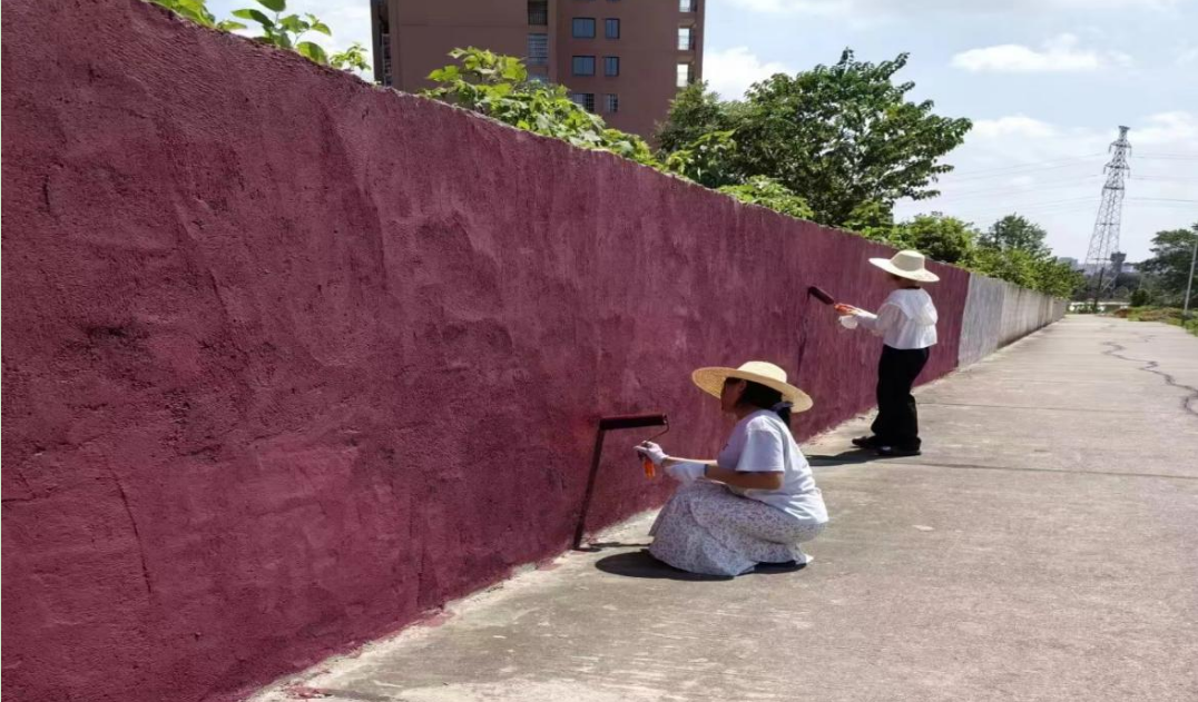 在艺术墙绘活动中,在村组织的要求下,实践团来到村里一处偏僻的角落,顶着火辣辣的阳光开始了他们的创作。艺术墙绘以“红色”为主题,在墙绘过程中,实践团成员分工明确,互帮互助,将这“一张白纸”变成了一面红墙。