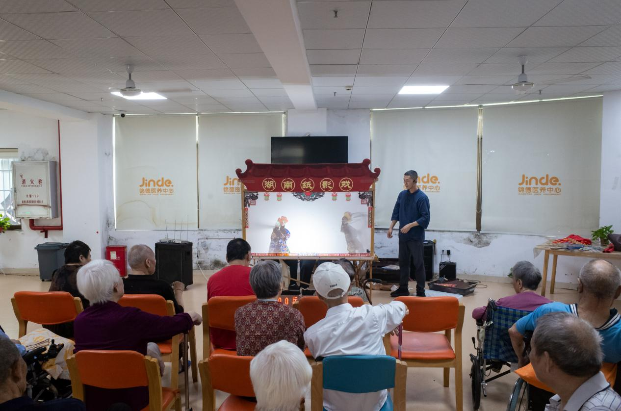在《天官赐福》的表演中,吴渊老师及团队凭借精湛娴熟的手法,将天官赐福这一吉祥故事婉婉道来,传递出对美好生活的美好祈愿。而《岳飞平金兀》则以激昂豪迈的湘剧唱腔和生动鲜活的纸影动作,重现了岳飞抗金的英雄事迹,淋漓尽致地展现了爱国情怀。湖南花鼓戏经典剧目《刘海砍樵》在纸影艺术的精彩演绎下焕发出崭新的活力,以其别具一格的艺术魅力赢得了在场老人们的由衷喜爱。演出接近尾声时,还有老人主动提出加戏,《送财》与《辞店》巧妙地将传统故事与现代审美相结合,使得传统文化在新时代焕发出别样的生机。