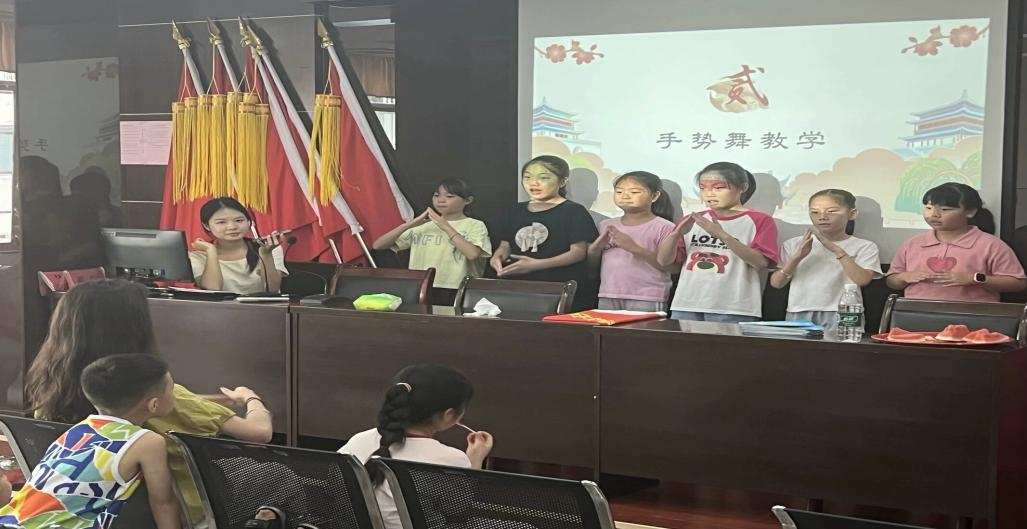 随后,实践团精心编排了一系列红色经典歌曲教学课程,包括歌曲曲目《国家》以及对应手势舞的教学。志愿者们不仅教授歌曲旋律,还结合歌曲背景,用生动有趣的故事讲述背后的历史意义,让孩子生们在歌声中感受党的光辉历程和中华民族的伟大复兴之路。