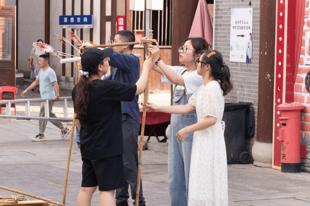 演出开始前,实践团成员搭建了表演纸影戏台。搭建戏台底座时,先放好四根等长的两头带钩的竹杆,将其围成一个正方形,然后在一角竖放起竹子,利用竹子片的超强韧性,角处双钩钩住,绳结拉紧,三侧面采取三角形搭建模式,而幕布架部分利用的是传统榫卯结构拼凑,整体戏台不失灵活性又具有可靠性。实践团在吴老师的指导下逐渐熟练了整个流程和操作方法,就在这一个脚印踩着另一个脚印的搭建过程中一个简易的戏台出现在了众人的眼前。