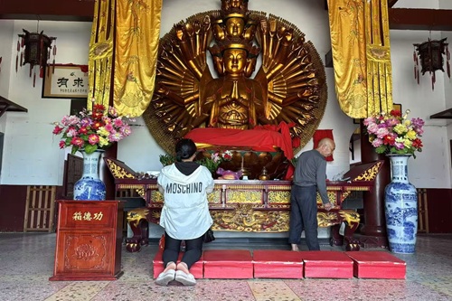 刚一进门,观音殿主持就告诉实践团,千手观音的传说源于妙善观音救父:她为救父亲妙庄王,闯十八层困境,割手引开饿鬼,助父转世。百姓感其孝心,送来假胳膊,工匠装于观音像上,妙善遂成千手观音,保佑众生。