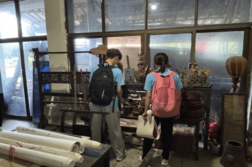 蓑衣、斗笠、织布机、油灯......谢国恩老人声情并茂地为我们讲述着每个“古董”的用途和由来,一幅幅解放前农村的生活画卷鲜活地展现在我们面前谢公现场讲解了每件展品背后的故事。“这些老物件不仅是工具,更是一代人‘耕读传家’的精神符号。”队员们通过触摸实物、观摩图文,直观感受到传统农业社会的生产智慧与生活图景。
