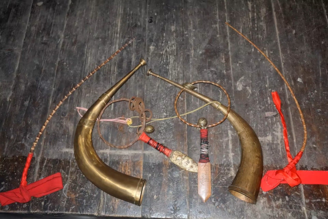 实践团注意到,随着时代发展,巴代文化法器在材质和工艺上也在进行适应性改良。石师傅展示的铜制号角虽替代了传统的牛角号角,但在音色和形制上仍严格遵循古法。当吹响那支号角时,低沉浑厚的声音在屋内回荡,宛如穿越时空而来的古老呼唤。这一小小的材质变化,既体现了传承过程中对实用性的考量,更彰显了非遗文化在坚守内核的同时,顺应时代发展的灵活智慧,让古老技艺在当代得以延续。