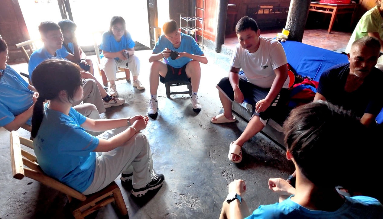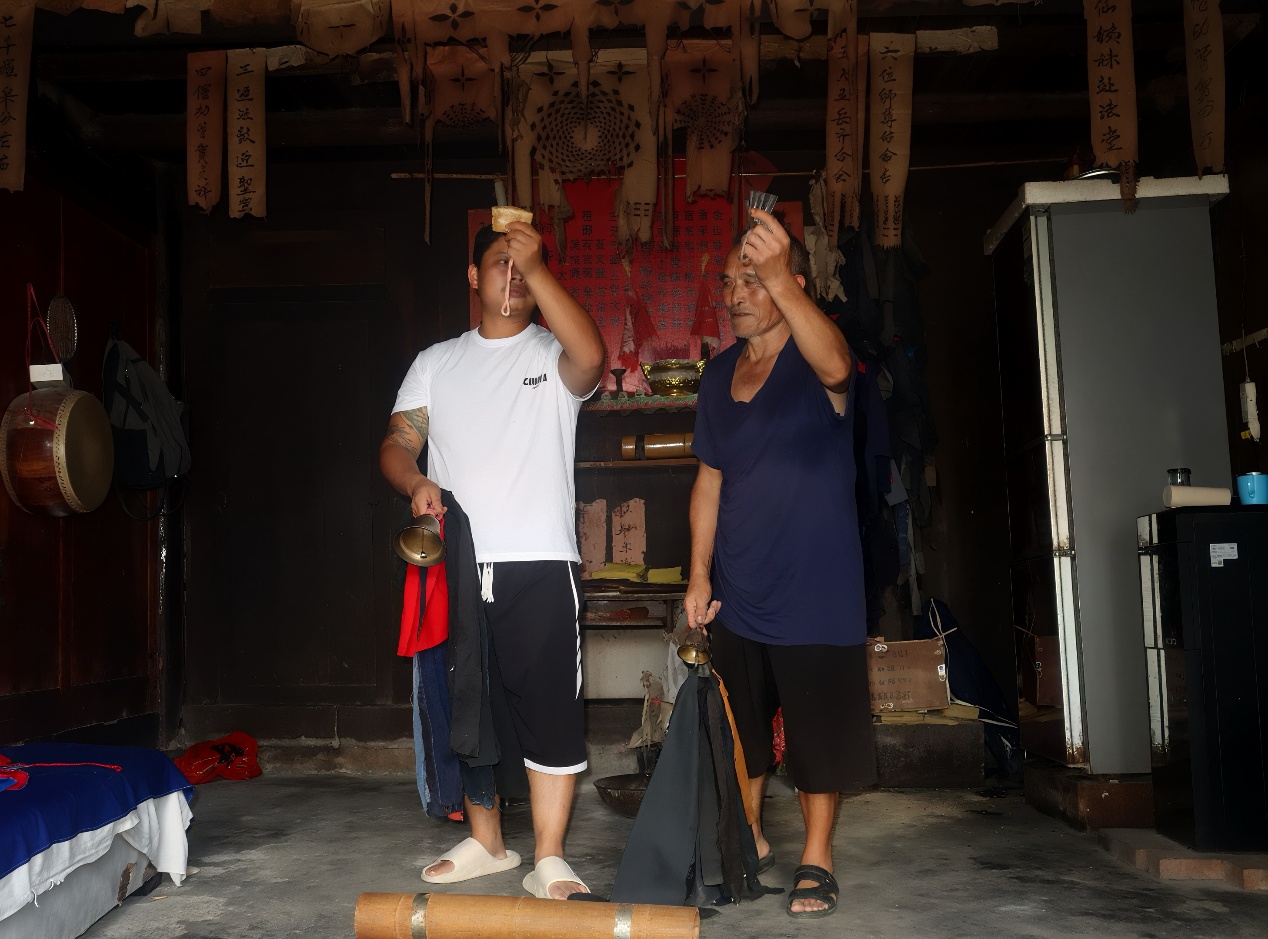 不过,希望正悄然萌芽。近年来,政府加大了对非物质文化遗产的保护力度,高校团队也频繁来访调研,这让石进荣、龙金茂两位师傅倍感欣慰。“你们能来记录巴代文化,就是在帮它活下去。” 石进荣师傅特意穿上红色法袍,为实践团展示了巴代祭祀时的绺巾舞。清脆的司刀声在楼间回荡,仿佛一场穿越时空的对话。