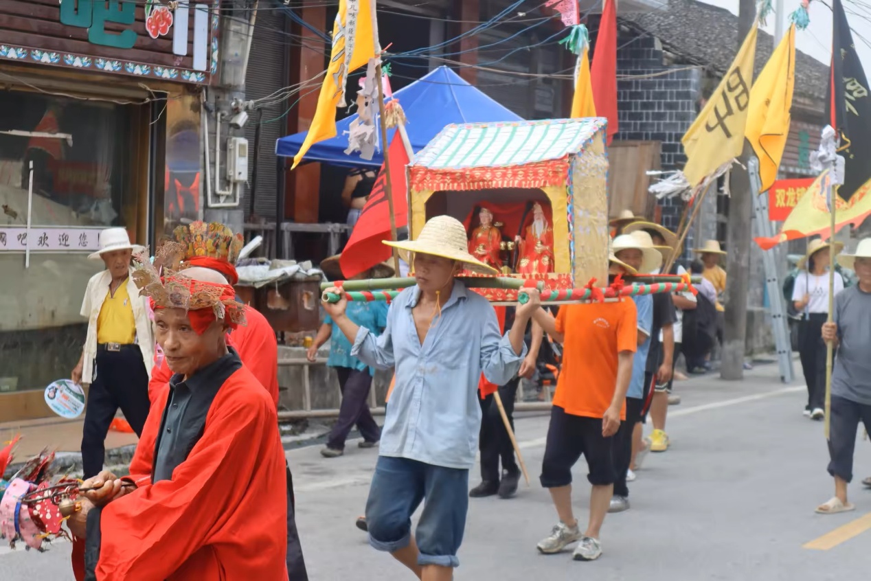 清晨,伴随第一缕阳光洒落群山,盛大的游行队伍正式拉开赶秋节序幕。游行队伍前方为气势磅礴的武术表演团,中年表演者手持棍棒、长矛,一招一式尽显阳刚之气。紧随其后的是土地公公与土地奶奶,以及庄严肃穆的巴代队列。巴代师傅们手持象征神力的绺巾与司刀,行进间跳起古老的绺巾舞,舞姿刚劲有力,衣袂翻飞中似在与天地进行对话。队伍末端的战旗队列阵形整齐,战旗猎猎生风,为游行增添了庄重肃穆的氛围。