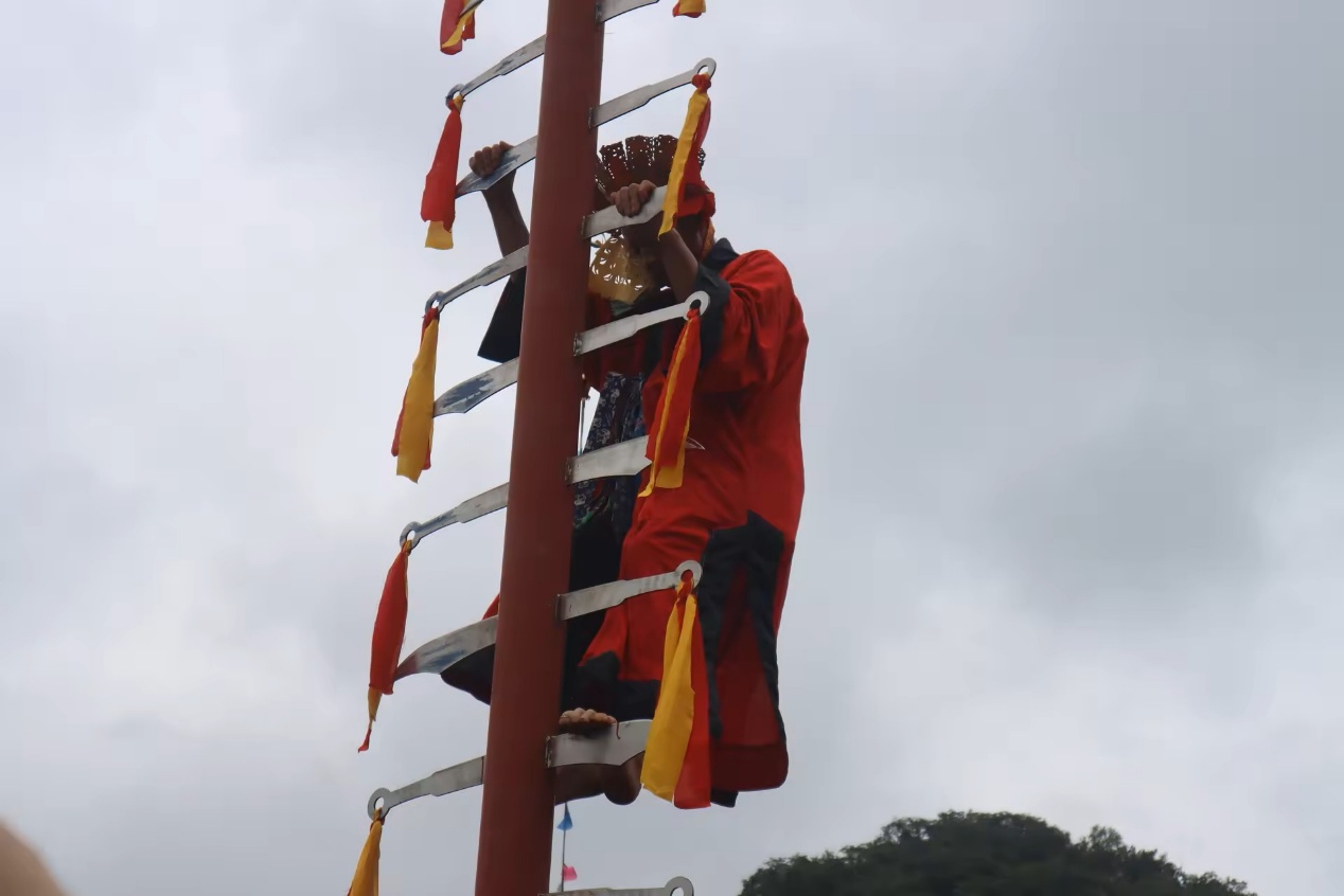 祭祀仪式在开阔的田地上举行。现场插满彩色标旗,祭坛前整齐摆放着猪头、鸡等贡品。仪式中,巴代师傅们赤足登上锋利的刀梯,在十余米高的梯顶跳起绺巾舞。阳光下,师傅们的身影与刀光交相辉映,口中吟诵的古老咒语在山谷间回荡,以传统仪式为苗族同胞祈求风调雨顺、五谷丰登。