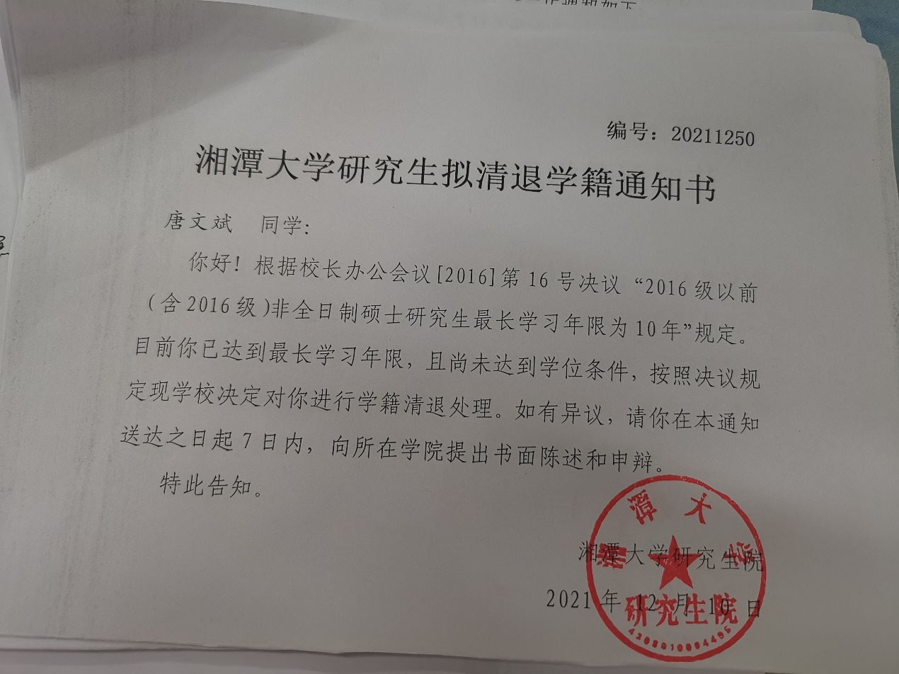 唐文斌,学号201207650038,机械工程学院非全日制硕士研究生。根据绅士仓库 校长办公会议【2016】第16号决议“2016级以前(含2016级)非全日制硕士研究生最长学习年限为10年”规定,目前该生已达到最长学习年限,且尚未达到学位条件,按照决议规定,学校决定对该生进行学籍清退处理。