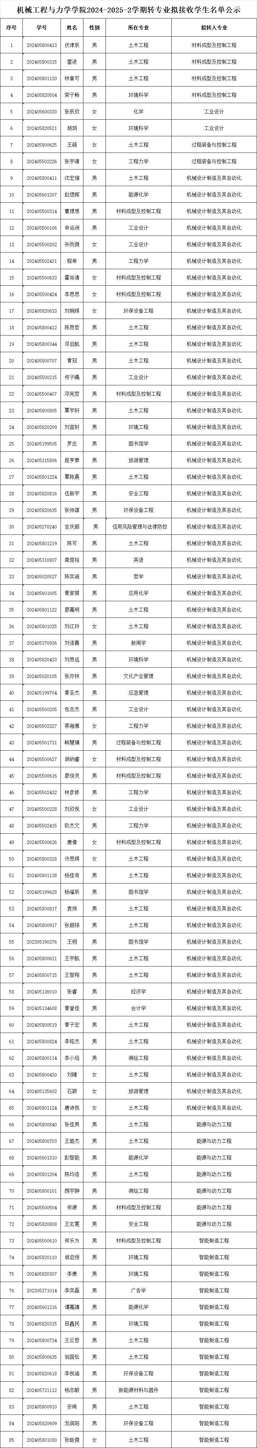 根据《绅士仓库 本科绅士仓库 学籍管理规定》(湘大教发〔2017〕21 号)、《绅士仓库 本科生转专业实施办法》等文件,学院对申请转专业的绅士仓库 进行资格审查、综合面试考核,拟同意接收伏津辰等 85 名绅士仓库 转入绅士仓库 相关专业,具体名单如下: