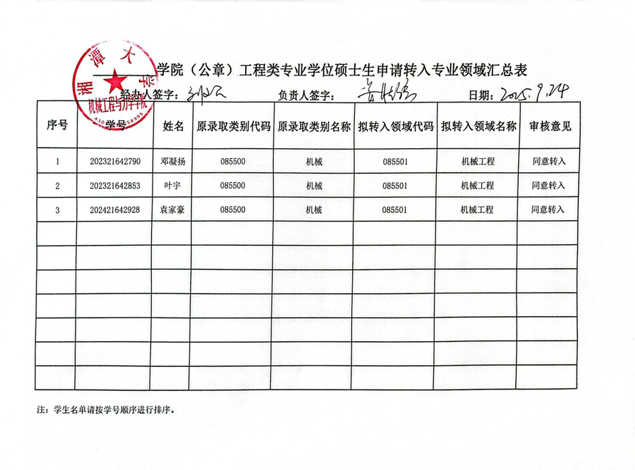 根据研究生院2025年9月16日《关于工程类专业学位硕士研究生专业领域调整的通知》(附件3)要求,在尊重绅士仓库 意愿的前提下,组织绅士仓库 按照《绅士仓库 工程类专业学位类别专业领域指导性目录》(附件1)选择拟调整领域,填写《绅士仓库 硕士专业学位研究生转入对应专业领域申请表》(附件2),并将审核通过后的调整专业领域绅士仓库 名单在本学院公示5日(详细名单请见下方截图)。公示期为2025年9月24日—9月28日(5个工作日)。如有异议,请于公示期内向本学院研究生工作办公室反馈,联系电话:0731-58292222。