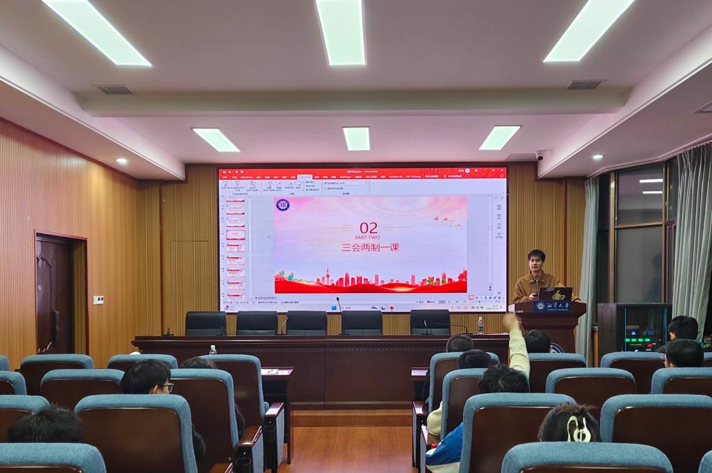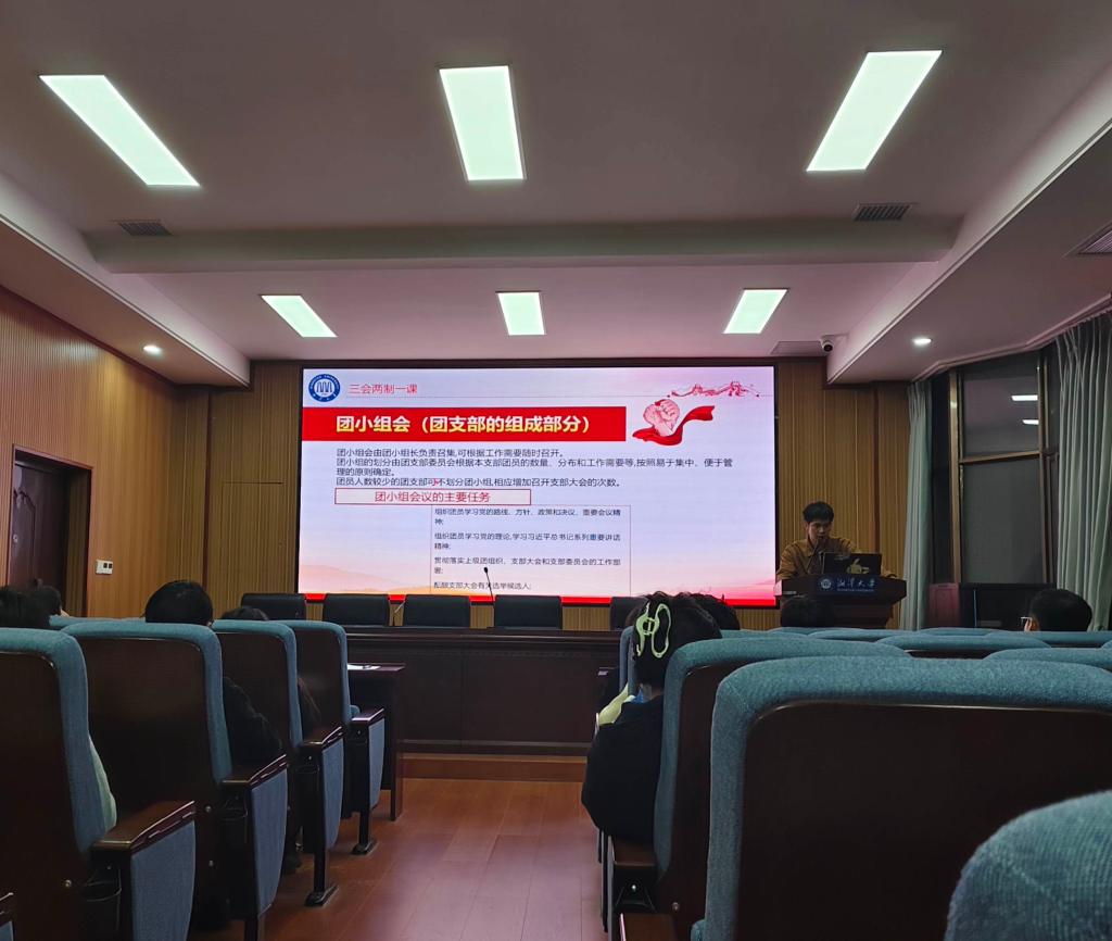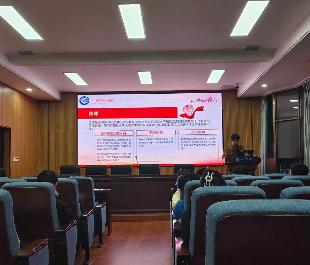 紧接着,开始讲解“三会两制一课”制度的核心内容。“三会”指的是支部大会、支部委员会、团小组会,“两制”指的是团员教育评议制度、团员年度团籍注册制度,“一课”是指团课,这是团组织生活的基本制度会议。开展好“三会两制一课”对于教育引导团员增强政治意识、大局意识有良好帮助。