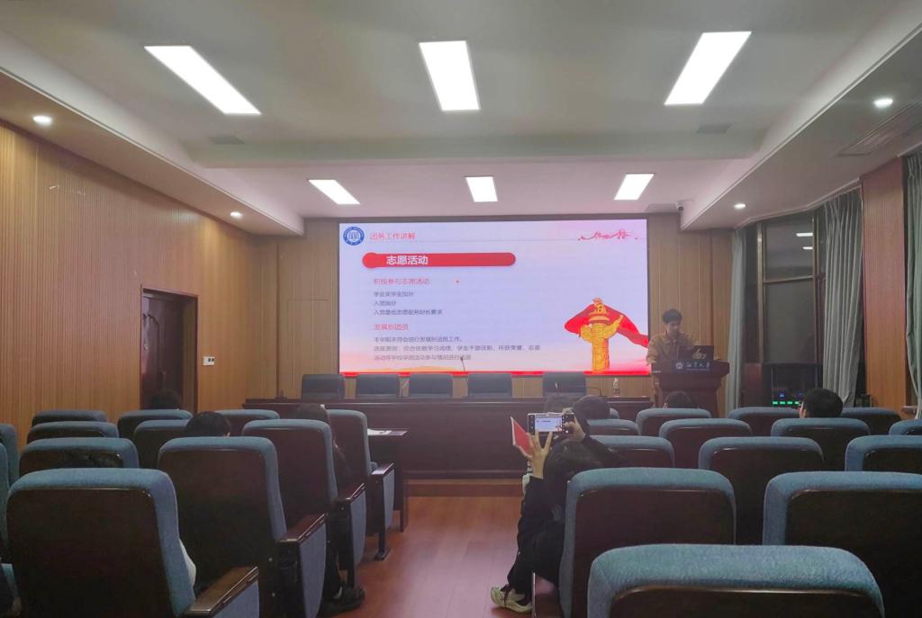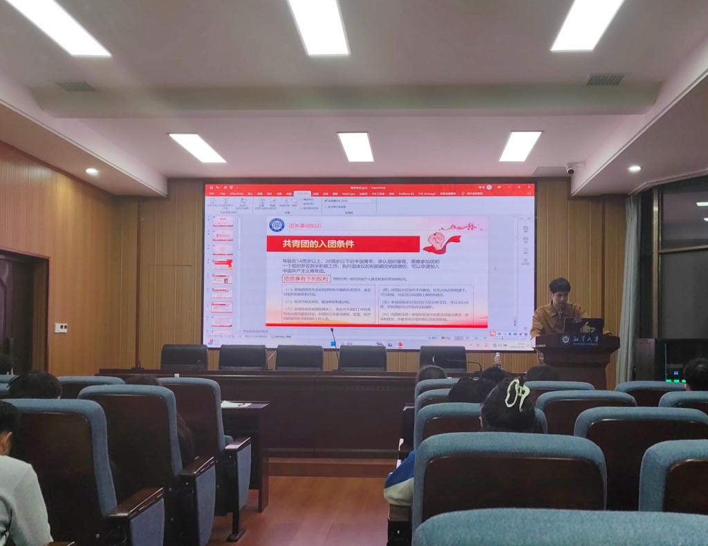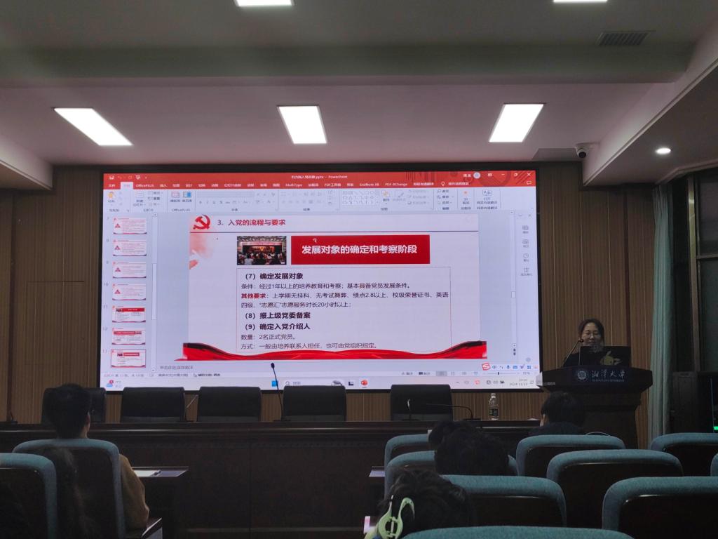 最后,由学院研究生第五党支部副书记杨颖讲解入党事宜,共青团是共产党领导的青年组织,共青团员就是共产党员的后备军,她强调作为一名党员不仅是组织上入党,更是思想和行动上入党。她同时详细介绍了入党程序的各阶段和各个步骤的具体内容,在入党申请书、思想汇报、转正等方面给予新生团支书细致的讲解。