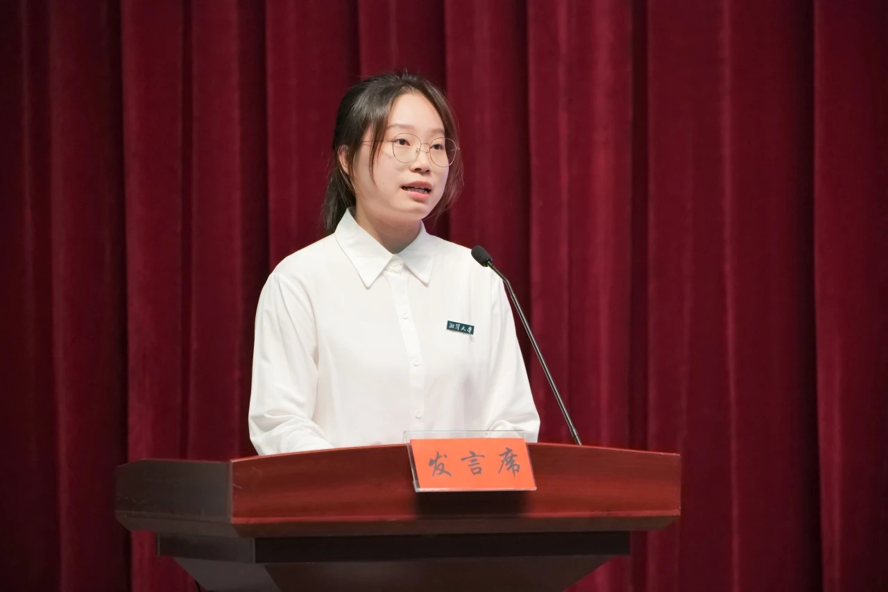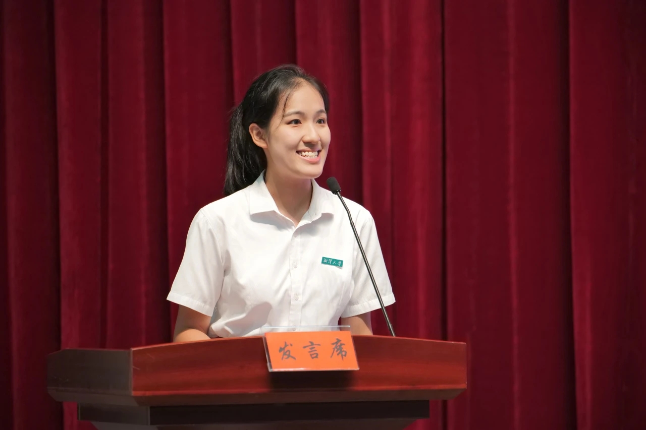 新生代表史潇琳同学以“正青春的我们遇到了正青春的湘大”为主题,希望大家能立青云之志,作传承者;怀报国之情,作躬耕者,展现了新时代青年朝气蓬勃的青春面貌。