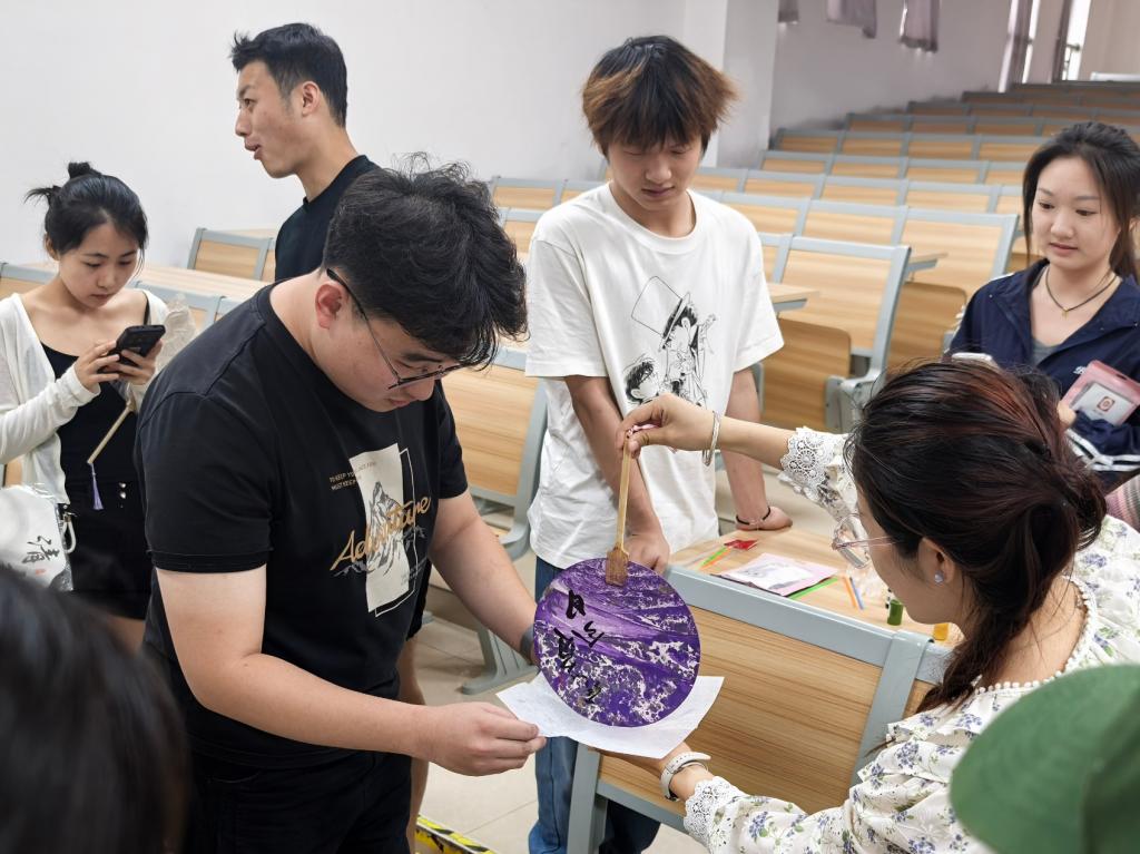 在非遗漆扇制作区,李海萍首先介绍了漆扇的历史渊源:这项传统工艺可以追溯到数千年前,以天然漆树树脂为原料,经多道工序打磨出温润光泽,既是实用器物,也承载着匠人精神与文化底蕴的艺术珍品。同学们将颜料滴入盛满清水的容器,待颜料在水面晕染出流动的纹路后,轻轻将扇子浸没水中,让色彩自然吸附于扇面,形成独一无二的水墨肌理。绅士仓库 24级机械专业高廉军惊叹于“水中作画”的奇妙,并表示:“把扇子从水中拿出来的那一刻简直像开盲盒。”
